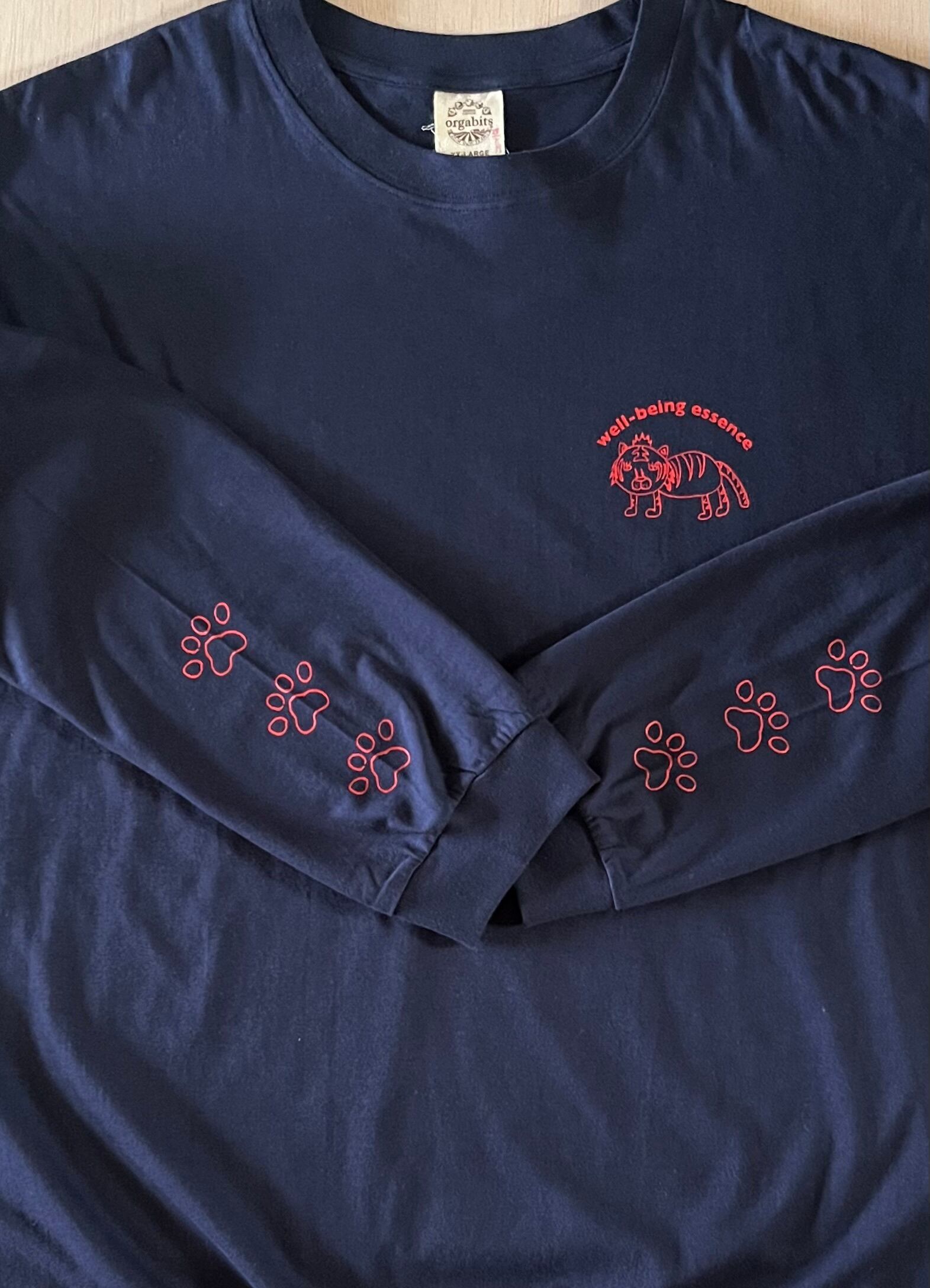 ロンT『とらねこちゃんソデ肉球』紺/オーガニックコットン男女兼用